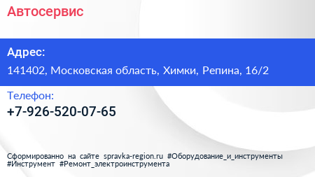 Автосервис по адресу 141402, Московская область, Химки, Репина, 16/2 в дальнейшем Организация, размещена в следующих категориях: