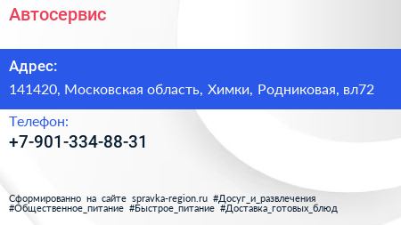 Автосервис по адресу 141420, Московская область, Химки, Родниковая, вл72 в дальнейшем Организация, размещена в следующих категориях: