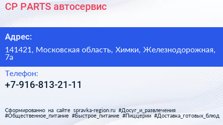 CP-PARTS, автосервис по адресу 141421, Московская область, Химки, Железнодорожная, 7а в дальнейшем Организация, размещена в следующих категориях: