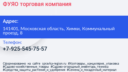 ФУЯО, торговая компания по адресу 141401, Московская область, Химки, Коммунальный проезд, 8 в дальнейшем Организация, размещена в следующих категориях: