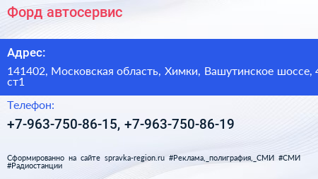 Форд, автосервис по адресу 141402, Московская область, Химки, Вашутинское шоссе, 4 ст1 в дальнейшем Организация, размещена в следующих категориях: