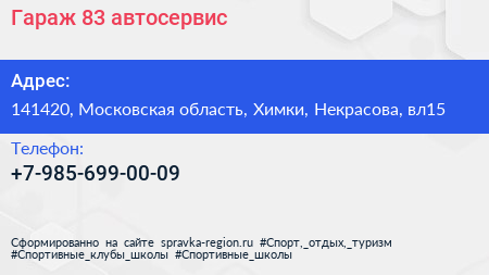 Гараж 83, автосервис по адресу 141420, Московская область, Химки, Некрасова, вл15 в дальнейшем Организация, размещена в следующих категориях: