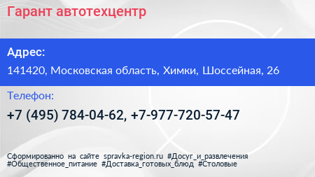Гарант, автотехцентр по адресу 141420, Московская область, Химки, Шоссейная, 26 в дальнейшем Организация, размещена в следующих категориях: