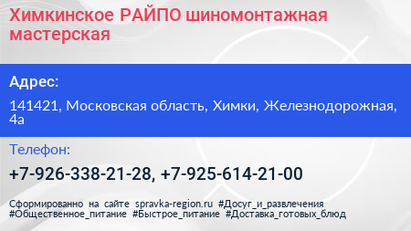 Химкинское РАЙПО, шиномонтажная мастерская по адресу 141421, Московская область, Химки, Железнодорожная, 4а в дальнейшем Организация, размещена в следующих категориях: