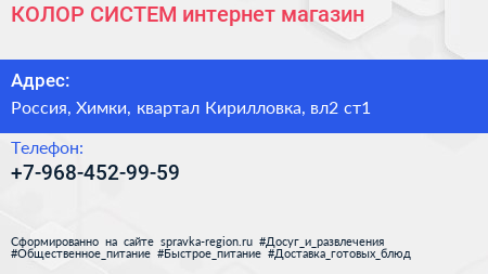 КОЛОР СИСТЕМ, интернет-магазин по адресу ТЦ Ленинградка, 2, Ленинградское шоссе, Черкизово, Молжаниновский район, Новоподрезково, Химки, городской округ Химки, Московская область, Центральный федеральный округ, 141436, Россия в дальнейшем Организация, размещена в следующих категориях: