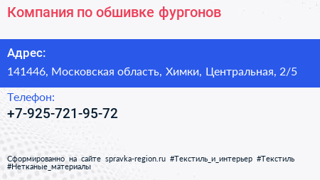 Компания по обшивке фургонов по адресу 141446, Московская область, Химки, Центральная, 2/5 в дальнейшем Организация, размещена в следующих категориях: