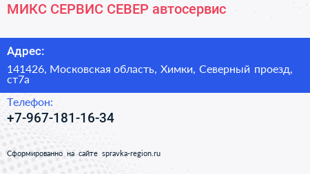МИКС СЕРВИС СЕВЕР, автосервис по адресу 141426, Московская область, Химки, Северный проезд, ст7а в дальнейшем Организация, размещена в следующих категориях: