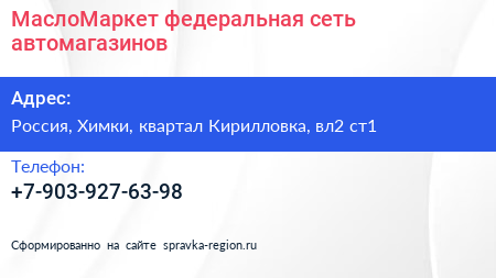 МаслоМаркет, федеральная сеть автомагазинов по адресу ТЦ Ленинградка, 2, Ленинградское шоссе, Черкизово, Молжаниновский район, Новоподрезково, Химки, городской округ Химки, Московская область, Центральный федеральный округ, 141436, Россия в дальнейшем Организация, размещена в следующих категориях: