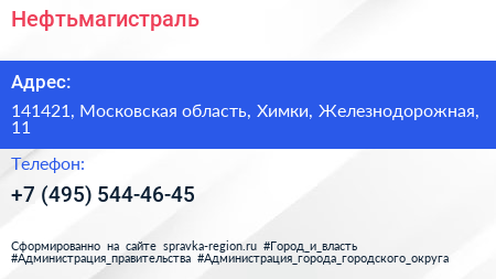 Нефтьмагистраль по адресу 141421, Московская область, Химки, Железнодорожная, 11 в дальнейшем Организация, размещена в следующих категориях: