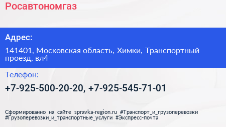 Росавтономгаз по адресу 141401, Московская область, Химки, Транспортный проезд, вл4 в дальнейшем Организация, размещена в следующих категориях: