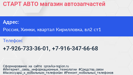 СТАРТ-АВТО, магазин автозапчастей по адресу ТЦ Ленинградка, 2, Ленинградское шоссе, Черкизово, Молжаниновский район, Новоподрезково, Химки, городской округ Химки, Московская область, Центральный федеральный округ, 141436, Россия в дальнейшем Организация, размещена в следующих категориях: