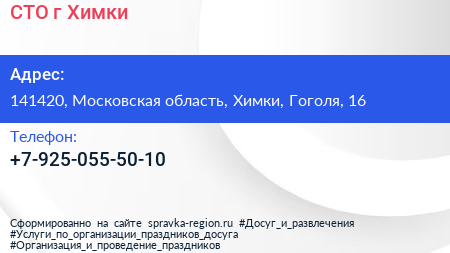 СТО, г. Химки по адресу 141420, Московская область, Химки, Гоголя, 16 в дальнейшем Организация, размещена в следующих категориях: