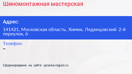 Шиномонтажная мастерская по адресу 141421, Московская область, Химки, Леденцовский 2-й переулок, 6 в дальнейшем Организация, размещена в следующих категориях: