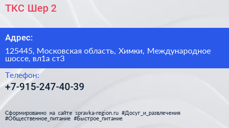 ТКС-Шер-2 по адресу 125445, Московская область, Химки, Международное шоссе, вл1а ст3 в дальнейшем Организация, размещена в следующих категориях: