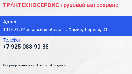 ТРАКТЕХНОСЕРВИС, грузовой автосервис по адресу 141421, Московская область, Химки, Горная, 31 в дальнейшем Организация, размещена в следующих категориях: