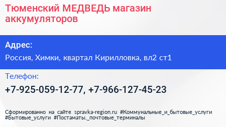Тюменский МЕДВЕДЬ, магазин аккумуляторов по адресу ТЦ Ленинградка, 2, Ленинградское шоссе, Черкизово, Молжаниновский район, Новоподрезково, Химки, городской округ Химки, Московская область, Центральный федеральный округ, 141436, Россия в дальнейшем Организация, размещена в следующих категориях: