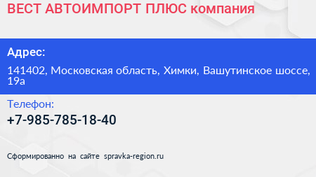 ВЕСТ АВТОИМПОРТ ПЛЮС, компания по адресу 141402, Московская область, Химки, Вашутинское шоссе, 19а в дальнейшем Организация, размещена в следующих категориях: