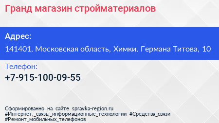 Гранд, магазин стройматериалов по адресу 141401, Московская область, Химки, Германа Титова, 10 в дальнейшем Организация, размещена в следующих категориях: