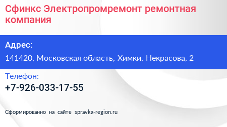Сфинкс-Электропромремонт, ремонтная компания по адресу 141420, Московская область, Химки, Некрасова, 2 в дальнейшем Организация, размещена в следующих категориях: