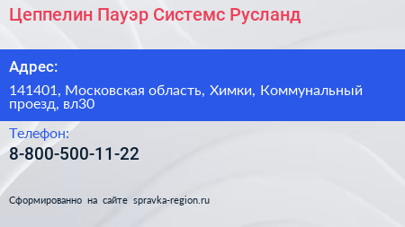 Цеппелин Пауэр Системс Русланд по адресу 141401, Московская область, Химки, Коммунальный проезд, вл30 в дальнейшем Организация, размещена в следующих категориях: