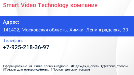 Smart Video Technology, компания по адресу 141402, Московская область, Химки, Ленинградская, 33 в дальнейшем Организация, размещена в следующих категориях: