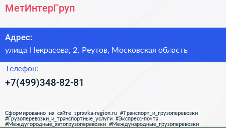 МетИнтерГруп по адресу улица Некрасова, 2, Реутов, Московская область в дальнейшем Организация, размещена в следующих категориях: