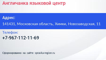 Англичанка, языковой центр по адресу 141431, Московская область, Химки, Новозаводская, 11 в дальнейшем Организация, размещена в следующих категориях: