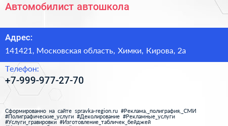 Автомобилист, автошкола по адресу 141421, Московская область, Химки, Кирова, 2а в дальнейшем Организация, размещена в следующих категориях: