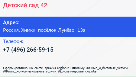 Детский сад №42 по адресу Детский сад № 42 "Планета детства", 13А, 46К-0030, Птицефабрика, Лунёво, городской округ Химки, Московская область, Центральный федеральный округ, 141580, Россия в дальнейшем Организация, размещена в следующих категориях: