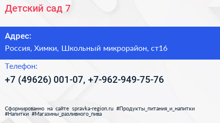 Детский сад №7 по адресу Детский сад "Солнышко", Лунная улица, Школьный микрорайон, Брёхово, городской округ Химки, Московская область, Центральный федеральный округ, 141544, Россия в дальнейшем Организация, размещена в следующих категориях: