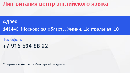 Лингвитания, центр английского языка по адресу 141446, Московская область, Химки, Центральная, 10 в дальнейшем Организация, размещена в следующих категориях:
