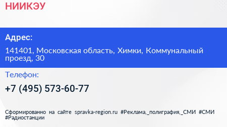 НИИКЭУ по адресу 141401, Московская область, Химки, Коммунальный проезд, 30 в дальнейшем Организация, размещена в следующих категориях: