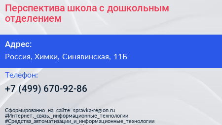 Перспектива, школа с дошкольным отделением по адресу Школа Перспектива, 1-я Сестрорецкая улица, Черкизово, Молжаниновский район, Новоподрезково, Москва, городской округ Химки, Москва, Центральный федеральный округ, 119618, Россия в дальнейшем Организация, размещена в следующих категориях: