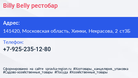 Billy Belly, рестобар по адресу 141420, Московская область, Химки, Некрасова, 2 ст3Б в дальнейшем Организация, размещена в следующих категориях: