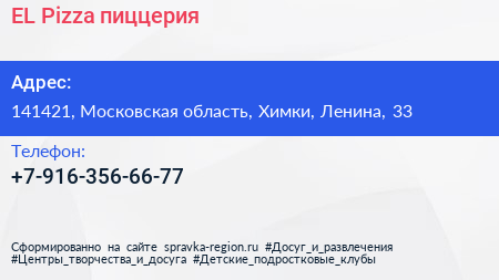 EL-Pizza, пиццерия по адресу 141421, Московская область, Химки, Ленина, 33 в дальнейшем Организация, размещена в следующих категориях: