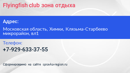 Flyingfish club, зона отдыха по адресу Московская область, Химки, Клязьма-Старбеево микрорайон, вл1 в дальнейшем Организация, размещена в следующих категориях: