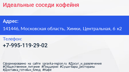 Идеальные соседи, кофейня по адресу 141446, Московская область, Химки, Центральная, 6 к2 в дальнейшем Организация, размещена в следующих категориях: