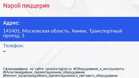 Napoli, пиццерия по адресу 141401, Московская область, Химки, Транспортный проезд, 3 в дальнейшем Организация, размещена в следующих категориях:
