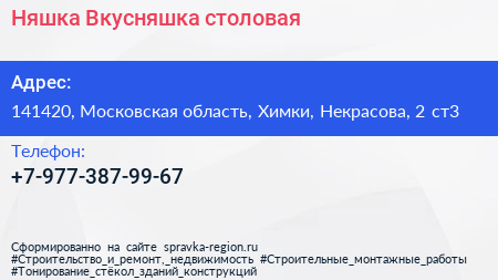 Няшка-Вкусняшка, столовая по адресу 141420, Московская область, Химки, Некрасова, 2 ст3 в дальнейшем Организация, размещена в следующих категориях: