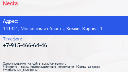 Necta по адресу 141421, Московская область, Химки, Кирова, 1 в дальнейшем Организация, размещена в следующих категориях:
