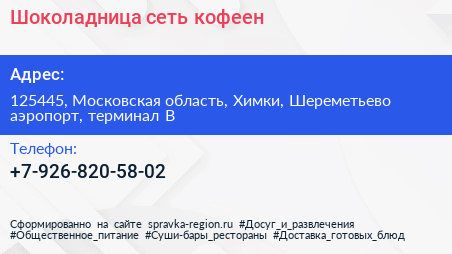 Шоколадница, сеть кофеен по адресу 125445, Московская область, Химки, Шереметьево аэропорт, терминал B в дальнейшем Организация, размещена в следующих категориях: