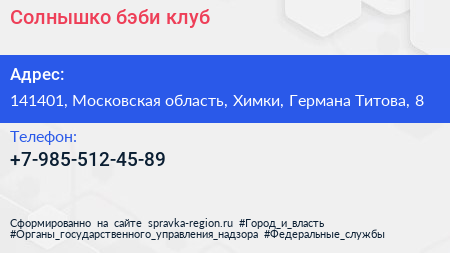 Солнышко, бэби-клуб по адресу 141401, Московская область, Химки, Германа Титова, 8 в дальнейшем Организация, размещена в следующих категориях: