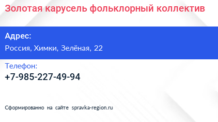 Золотая карусель, фольклорный коллектив по адресу Дом культуры, Строительный проезд, Школьный микрорайон, Брёхово, городской округ Солнечногорск, Московская область, Центральный федеральный округ, 141544, Россия в дальнейшем Организация, размещена в следующих категориях: