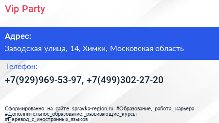 Vip-Party по адресу Заводская улица, 14, Химки, Московская область в дальнейшем Организация, размещена в следующих категориях: