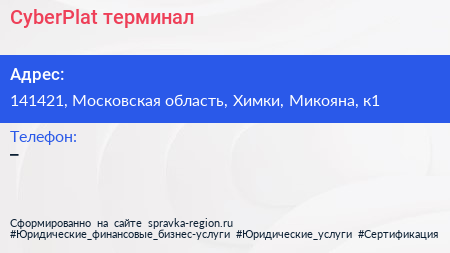 CyberPlat, терминал по адресу 141421, Московская область, Химки, Микояна, к1 в дальнейшем Организация, размещена в следующих категориях: