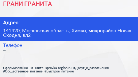 ГРАНИ-ГРАНИТА по адресу 141420, Московская область, Химки, микрорайон Новая Сходня, вл2 в дальнейшем Организация, размещена в следующих категориях: