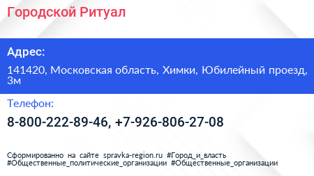 Городской Ритуал по адресу 141420, Московская область, Химки, Юбилейный проезд, 3м в дальнейшем Организация, размещена в следующих категориях: