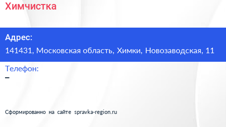 Химчистка по адресу 141431, Московская область, Химки, Новозаводская, 11 в дальнейшем Организация, размещена в следующих категориях: