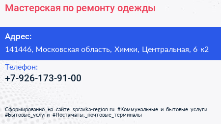 Мастерская по ремонту одежды по адресу 141446, Московская область, Химки, Центральная, 6 к2 в дальнейшем Организация, размещена в следующих категориях: