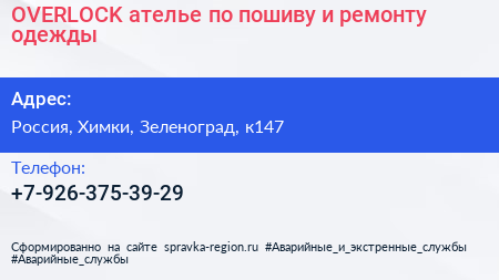 OVERLOCK, ателье по пошиву и ремонту одежды по адресу Спортивно-досуговый центр ГБУ "Талисман", к147, улица Николая Злобина, 1-й микрорайон, район Матушкино, Зеленоград, Москва, Центральный федеральный округ, 103489, Россия в дальнейшем Организация, размещена в следующих категориях: